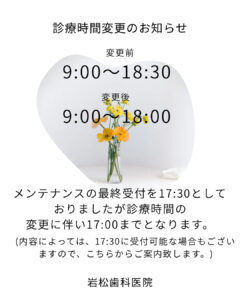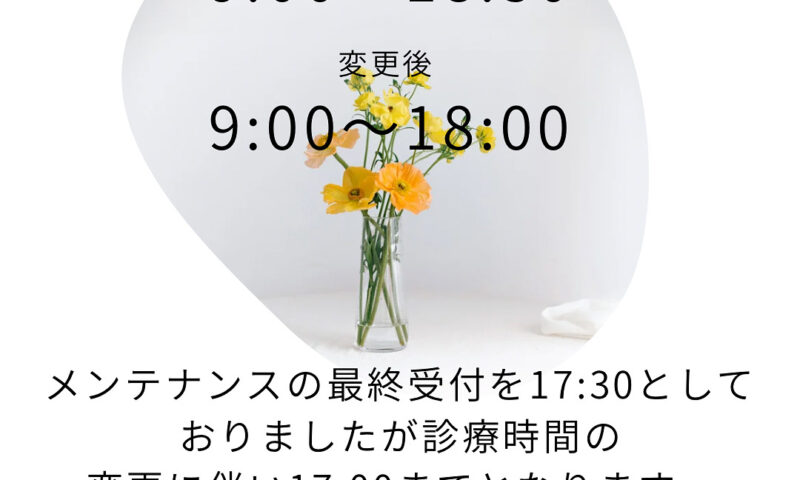 メンテナンスの最終受付を17時30分としておりましたが 診療時間の変更に伴い17時00分までとなります。 (内容によっては、17時30分に受付可能な場合もございますので、こちらからご案内致します。)